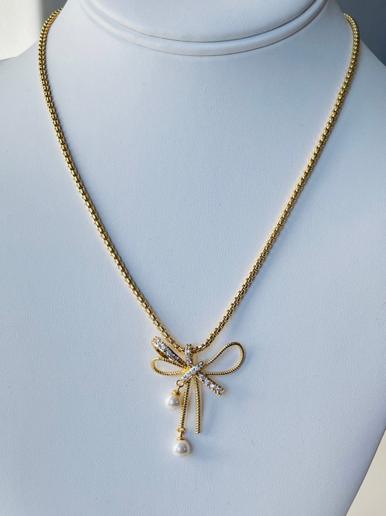 18k gold plated brass Venetian box chain with large gold plate and cubic zirconia bow pendant.