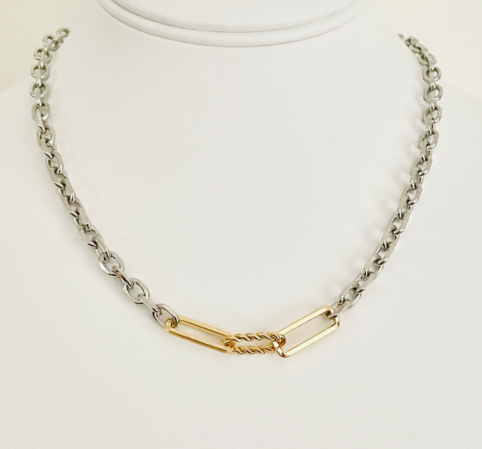 A beautiful mixed metal necklace that effortlessly combines the elegance of platinum and the allure of gold. This mixed metal necklace effortlessly elevates any outfit, from casual to formal, making it a versatile and must-have addition to your jewelry collection.