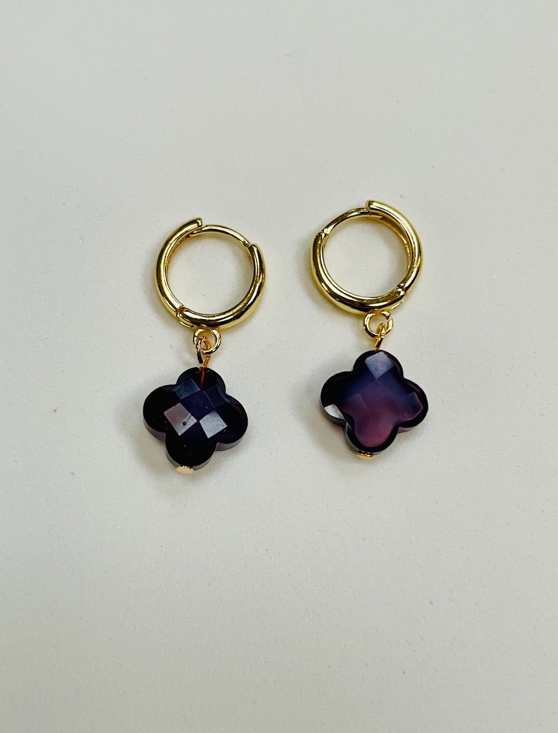 These hoops feature brass plated in 18k gold or platinum, adorned with faceted glass clover charms for a charming and elegant look.