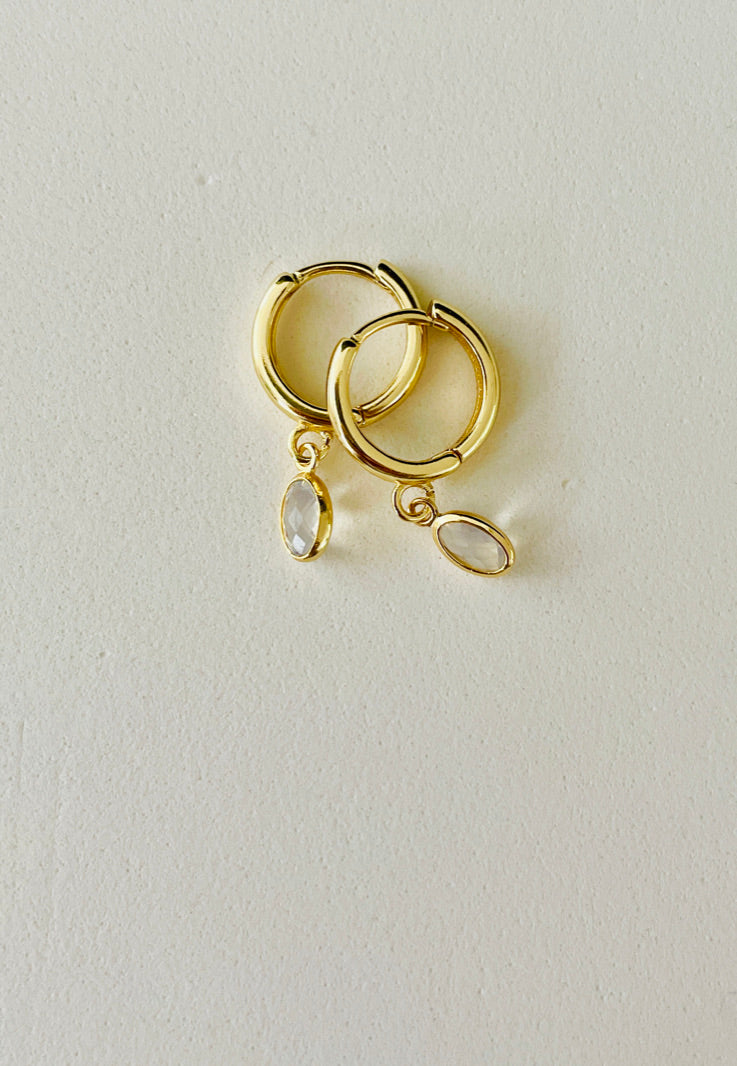 These fun hoops are crafted from 18k gold-plated brass and sparkle with dangling colorful glass charms for a lively touch.